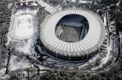 Una veduta dall'alto dello stadio 'Olimpico', ricoperto dai fiocchi bianchi