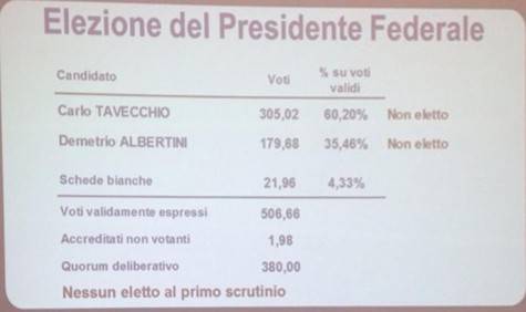 Ore 15:30 Risultati prima votazione: Tavecchio 305.2 voti (60,2%), Albertini 179,68 (35,46%) si procede con la seconda votazione