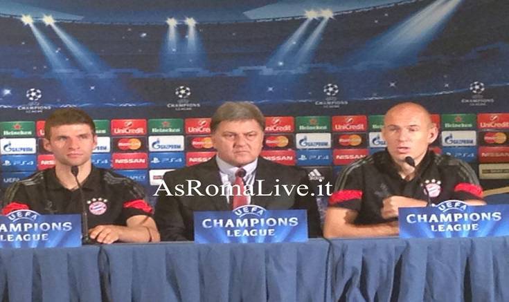 Appena sbarcati a Roma, Thomas Muller e Arjen Robben hanno preso parte alla conferenza stampa di presentazione del match di Champions League che i campioni di Germania affronteranno domano allo stadio Olimpico contro la Roma. L’allenatore Pep Guardiola è arrivato in un secondo momento. Queste le parole dei giocatori e del tecnico spagnolo: