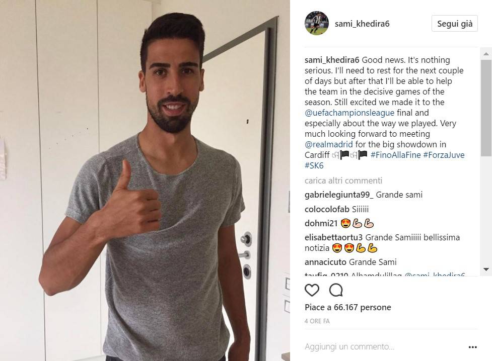 “Buone notizie. Non è niente di serio, ho bisogno di riposare per un paio di giorni ma dopo allora sarà pronto ad aiutare la squadra nelle decisive gare della stagione. Sono ancora eccitato per aver raggiunto la finale di Champions League e specialmente per come l’abbiamo fatto. Penso già a incontrare il Real Madrid a Cardiff per quello che sarà un grande spettacolo”: questo il messaggio di Khedira che ha cercato di tranquillizzare i tifosi della Juventus sulle sue condizioni di salute. Il centrocampista tedesco dovrà fermarsi un paio di giorni per poi tornare a disposizione di mister Allegri. “Riposerò per i prossimi due giorni – spiega il giocatore su Instagram – e dopo sarò pronto ad aiutare la squadra nelle partite decisive”. Il centrocampista tornerà disponibile per la finale di Coppa Italia.