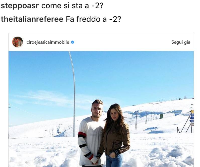 La gita sulla neve, immortalata su Instagram con alcune foto, non è certamente passata inosservata ad alcuni tifosi romanisti, ancora in pieno clima derby. Tra i tanti commenti, ecco comparire anche quelli ironici da parte dei sostenitori giallorossi: “Fa freddo a -2?“. Due come quei punti che separano la Roma dalla Lazio nella classifica della Serie A dopo la gara di sabato, quella del sorpasso. Il derby della Capitale non finisce mai.