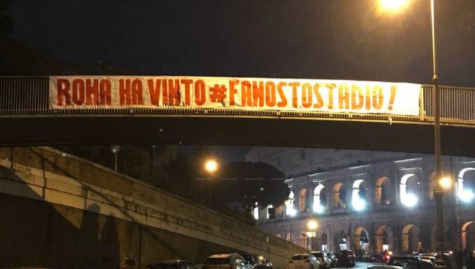 “Roma ha vinto, #famostostadio”: questo il messaggio sullo striscione apparso nella notte nei pressi del Colosseo a Roma.