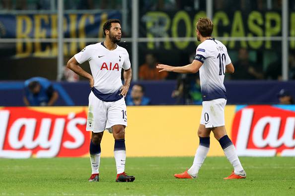 MILAN, ITALY – SEPTEMBER 18: Mousa Dembele and Harry Kane of Tottenham Hotspur look dejected as Mauro Icardi of Inter Milan scores his team’s first goal during the Group B match of the UEFA Champions League between FC Internazionale and Tottenham Hotspur at San Siro Stadium on September 18, 2018 in Milan, Italy. (Photo by Dan Istitene/Getty Images)