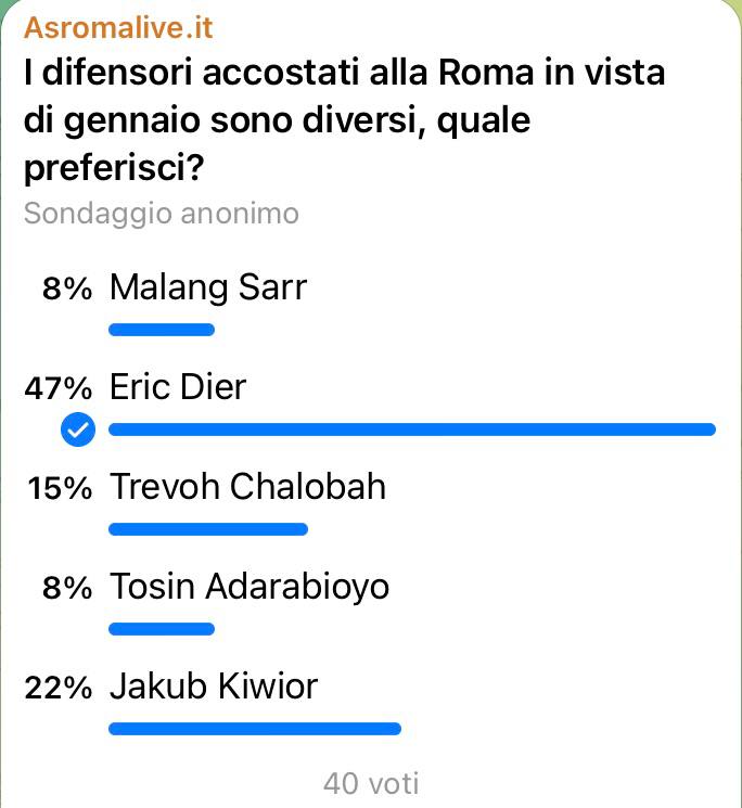 In un sondaggio abbiamo chiesto agli utenti di asromalive.it di esprimere un parere in merito al difensore che vorrebbero in giallorosso. Il 47% dei votanti ritiene che il colpo più congeniale per rinforzare la difesa della Roma sarebbe l’acquisto di Dier. Più staccato Chalobah (15%). Appaiati in coda Adarabioyo e Sarr (8%).